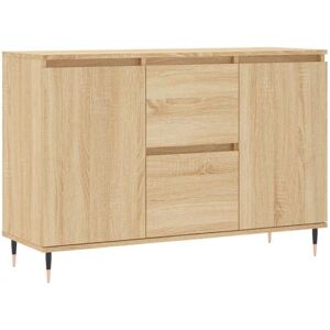 This trendy sideboard, featuring a timeless look, is meant to be an excellent addition to your home. Durable material: The engineered wood is of exceptional quality with smooth surface and also features strength, stability and resistance to moisture. Made of engineered wood, the storage cabinet is easy to clean with a damp cloth. Ample storage space: The buffet offers ample storage space for keeping your various daily essentials well organised and within easy reach. Displaying function: The top of the sideboard cabinet is perfect for displaying your decorative items, picture frames, and potted plants. Iron legs: The iron legs of the side cabinet ensure sturdiness and stability. Warning: To prevent it being overturned, this product must be used with the provided wall attachment device. Colour: Sonoma oak Material: Engineered wood, iron Dimensions: 101.5 x 35 x 70 cm (W x D x H) Assembly required: Yes Legal Documents: More details about preventing your furniture from tipping over can be