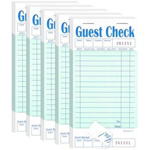 Guest check books size is 6.69x3.15inch, perfectly fit for waiter checkbook and these notepad can be easily carried in a pocket or apron, ensuring that server always has them on hand when needed. Suitable for restaurant, hotel, cafe wait Each ticket has a serial number printed at the top, date, order details, number of guests, order amount, table No.etc. Our server note pads also have prompts for appetizer, soup or salad, entree, dessert, and beverage. Food receipt book with a tear-free dotted line that makes each check easily tear from the ticket book that can as customer's receipt or keep for record. We've provided extra rows on the back for additional note taking. Thickened paper, The waitress notepad has a fresh and bright green design, which makes them no longer monotonous. Their whole page printing has clear handwriting and a reasonable layout. Make your writing easier and work more satisfactory. You receive a 5 pack of restaurant order pad, 50 sheets per pack, total 250 sheets.