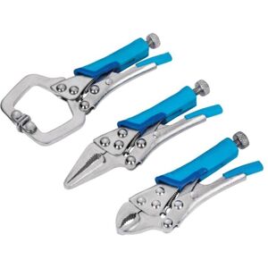 Blue Spot Tools: Mini Locking Pliers Set, 3 Piece B/S6528 The BlueSpot Mini Locking Pliers are chrome plated for corrosion protection. They feature a quick-release function to adjust the jaw width, making them ideal for gripping a wide range of materials. Fitted with soft grip handles for increased user comfort. Ideal for work on small applications. The set contains 3 pliers 1 x 113mm Long Jaw Locking Plier 1 x 125mm Locking C Clamp 1 x 100mm Self Grip Plier MPN: B/S6528 EAN: 5028734065282 Mini Locking Pliers Set, 3 Piece B/S6528 Attributes: Finish/Coating: Chrome-Plated Handle Type: Soft Grip Number of Pieces: 3
