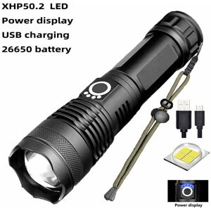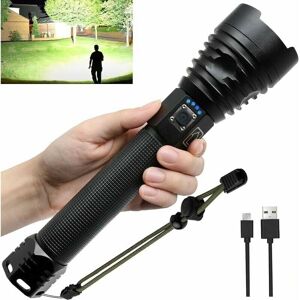 【ULTRA POWERFUL 12000 LUMENS LED FLASHLIGHT】S9322 rechargeable flashlight uses advanced XHP70.2 LED chip, which is stable and super bright, 20 times brighter than ordinary incandescent lamps. Easily illuminate an entire room and maximum beam distance up to 1000 meters! Torch light is made of excellent aviation aluminum alloy, and the surface coating has been specially oxidized, wear-resistant and drop-resistant. 【5 LIGHTING MODES 【ADJUSTABLE FOCUS & IMPROVED SWITCH】 Powerful high brightness flashlight has 5 lighting modes (High Medium Low Strobe SOS). The wide-to-narrow beam zoom makes it ideal for camping and hiking. Improved switch design, Hold the switch for 3 seconds. Prevents flashlight from being turned on accidentally when inserted into pocket, Causes battery to run out and cannot be charged. 【POWERFUL 21700 BATTERY AND TYPE-C CHARGE 【USB OUTPUT】This rechargeable flashlight adopt 5000mAh 21700 rechargeable lithium battery, 50% higher discharge energy than 18650