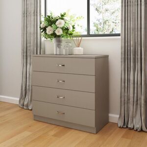 Enhance your bedroom with the Promo 4 Drawer Chest, a perfect blend of convenience, style, and functionality. Finished in a soft and elegant Putty, this chest adds a modern and calming touch to any sleeping space. The compact design makes it ideal for keeping your clothing and personal items organized. With four spacious drawers, you'll find ample concealed storage for all your essentials, helping you maintain an organised and clutter-free environment. Crafted from high-quality materials, this chest features a strong melamine scratch-resistant surface, ensuring it withstands daily use while retaining its smooth and attractive finish. The contemporary chrome effect metal pull handles beautifully complement the premium finish, adding a touch of modern elegance. Designed for modern living, the Promo 4 Drawer Chest is delivered flat-packed for easy self-assembly, making it an ideal choice for those who value both space and convenience. Compact yet highly practical, this chest is a
