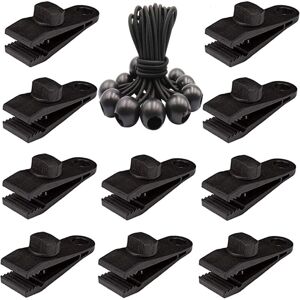 Great Value - 10pcs tarp clips + 10pcs bungee cords. Widely used at home or for tarps, outdoor camping/picnic, canvas, awnings, boat covers, tents, pool covers. 3.27 x 1.06 x 1.22 inches, the jaws can be opened about 0.25 inches, the hole is 0.5 inches in diameter. High Elastic Bungee Cords with Balls - Size: The length of the bungee cord is 8.5 inches (including the ball) and stretches to 15.7 inches (including the ball), the diameter of the cord is 0.2 inches (5 mm), the diameter of the nylon ball is 1 inch. Durable Material: The tarp clips are made of durable PA material, waterproof and unbreakable, while the bungee cords are made of high quality rubber, durable and fray resistant, the elastic design provides constant tension and a firm hold.