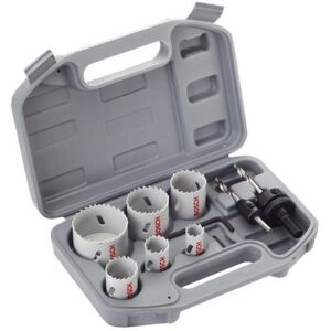The 9 Piece Bosch HSS Bi-metal Hole saw Set for Electrician's. Made of bi-metal HSS containing 8% cobalt alloy for long-lasting cutting. The tooth configuration (Vario tooth strip) is ideal for gliding through material to provide smooth cuts. They fit all standard adaptors on the market. Supplied in a handy carry case. Contains: 6 x HSS Bi-metal Hole saws: 20, 25, 32, 38, 51, 64mm 1 x 11mm Hexagon Socket Adaptor (for hole saws 32-64mm Ø) 1 x 6.35mm Hexagon Socket Adaptor (for hole saws 20-25mm Ø) 1 x Allen Key