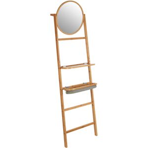 Bring a touch of natural wood grain to your bathroom with this freestanding bamboo towel rack. It includes one removable wood shelf and one removable fabric tray that have ample space for storing and organizing toiletries, and a round adjustable vanity mirror. Hykkon