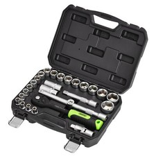 Bunker 29445 Socket Set, 3/8" Sq. Dr. in EVA Foam Inlay - Draper 24234, This socket set is made from chrome vanadium steel with a satin chrome finish. It includes a wide range of 1/2" Sq. Dr. 6-point HI-TORQ® sockets in sizes 8-32mm. The 72-tooth quick release ratchet is equipped with a soft grip handle for comfort. The set includes extension bars (125, 250mm), spark plug sockets (16, 21mm), universal joint and 3-way adaptor. All of these items are supplied inside a sturdy plastic storage case. Draper 24234 HI-TORQ® Metric Socket Set, 1/2" Sq. Dr. (27 Piece)