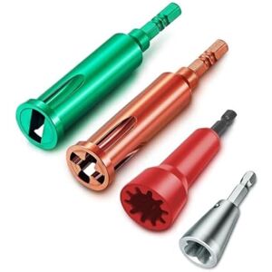 [4-Piece Wire Twister Tool]: This wire twister kit includes a stranded wire connector with 1/4 inch clamp (red), a convenient 3-way cable stripper (green); an advanced 5 Route wire stripping and twisting device (copper color) and a new single-use paralleling device 2.5/4/6 square millimeter, which can achieve a twist-like effect. Meet all your wiring needs when twisting wires. [Stringing Tool Specifications]: The stranding electrician's tool with 1/4 inch chuck is compatible with most wire caps and can be used with the most common drill bits; 3-way and 5-way stranding tools are suitable for 2.5-4 square millimeter ( Universal model); the silver single-use paralleling device can achieve 2-5 , making this kit Perfect for a variety of wire gauges and applications, providing you with more convenience. [Easy to operate]: First, fix the wire twisting tool on the electric drill, arrange the prepared wires neatly, and tighten them with pliers; Then insert the wires into holes of the twisting