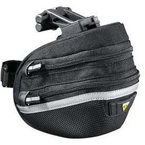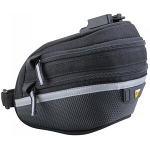 Topeak Wedge II Updated and improved version of Topeak's popular wedge pack Durable 1000 Denier fabric construction Simple, high quality quick release mounting system Includes rain cover (Sml, Med, Lrg) 3M reflective strip Tail light strap Micro: 12.5x8.5x9.5cm, 0.5L, 77g Small: 16.5x10.5x11.8cm, 0.8L, 135g Medium: 16.5x10.5x12.3cm, 0.95-1.25L, 152g Large: 18.5x11.5x13cm, 1.25-1.65L, 183g