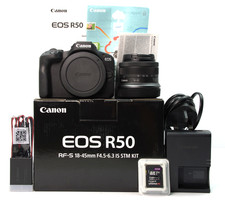 TheCanon EOS R50is an entry-level APS-C mirrorless camera that is perfect for beginners or content creators who wish to upgrade from a smartphone. The EOS R50 features a 24.2mp APS-C Dual Pixel CMOS AF II sensor capable of up to 12fps (15fps with electronic shutter), 4K/30P or Full HD 120P video and a vertical shooting function for easy sharing on Tik Tok, YouTube Shorts or Instagram. There is even a Guided User Interface to enhance your creativity and photographic skills right out of the box. This kit comes with the RF-S 18-45mm f4.5-6.3 IS STM Lens. Canon EOS R50 with RF-S 18-45mm f4.5-6.3 IS STM Lens - Black The Canon EOS R50 is an entry-level APS-C mirrorless camera that is perfect for beginners or content creators who wish to upgrade from a smartphone. The EOS R50 features a 24.2mp APS-C Dual Pixel CMOS AF II sensor capable of up to 12fps (15fps with electronic shutter), 4K/30P or Full HD 120P video and a vertical shooting function for easy sharing on Tik T