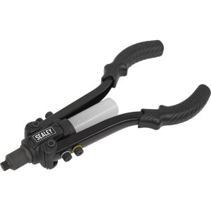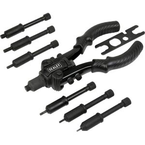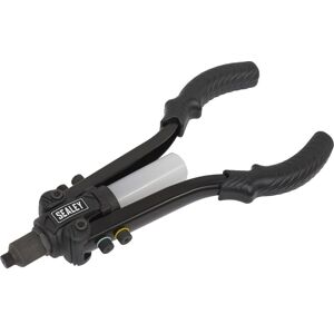 High grade aluminium die-cast body with heat treated carbon steel handle. Heat treated chrome steel 3-piece jaws and jaw case. Composite handgrips with spanner storage. Four nozzles to accept 2.4mm(3/32"), 3.2mm(1/8"), 4mm(5/32") and 4.8mm(3/16") rivets. Supplied with nozzle spanner. Features & Benefits: • Suitable for aluminium, steel and stainless steel rivets. • High grade aluminium die-cast body with heat treated carbon steel handle. • Heat treated chrome steel 3-piece jaws and jaw case. • Composite handgrips with spanner storage. • Four nozzles to accept 2.4mm(3/32"), 3.2mm(1/8"), 4mm(5/32") and 4.8mm(3/16") rivets. • Supplied with nozzle spanner. • Model No. AK992 Specifications: Model No AK992 Brand: Sealey Length: 250mm Nett Weight: 0.54kg Rivet Types: Aluminium - Yes, Steel - Yes, Stainless Steel - Yes, Structural - No