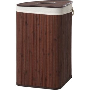 The Kankyo 58 litre laundry hamper has a dark brown colour with light graining. Its cream coloured lining is made from soft cotton which folds over the top of the hamper and ties into a bow. The lid is also made from bamboo, and has a faux leather handle.