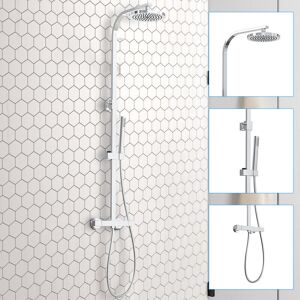Features -Built in 38 degree anti-scalding device, which makes it ideal for family bathrooms. -Exposed square bar shower valve with thermostatic control. -Solid brass valve for extreme durability and strength. -Chrome Plated Finish. -Adjustable Stainless Steel Riser Rail. -Adjustable holder for Handset which can be moved up and down. -The shower head features a ball joint between the head and the connection, allowing you to tilt the drench head to direct the water flow exactly where you want it. -ABS round shower head and handset. -Safe And Comfortable. Specification Finish: Chrome Shower Head Diameter: 200mm Shower Hose Length: 1500mm Shower Arm Projection: 343mm Pipe Centres:150mm The P&P is only for those addresses in Mainland England.A surcharge will apply to the remote areas .