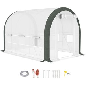 A large open design, this Outsunny 4 x 3 m polytunnel greenhouse offers plenty of room for plants and more. Walk in and walk out - it's that spacious. A galvanised steel frame for a strong core, it comes with a two-layer mesh cover to create safe shelter inside the middle reinforcement makes the cover extra tough. A large door for easy access, with six windows to bring fresh air in easily. Set comes with 4x ground stakes, 4x guy ropes, 10x plant labels and 1x pair of gloves. Specifications: ● Colour: White, Grey ● Material: Galvanised Steel, 140 GSM PE, Polyester ● Overall Dimensions: 396L x 300W x 200Hcm ● Side Window Dimensions: 47W x 40Hcm ● Outer Door Dimensions: 174W x 155Hcm ● Inner Mesh Door Dimensions: 153W x 185Hcm ● Windproof Level (when fully fixed): Level 5-6 ● Item Label: 845-921V01WT Features: ● Reinforced and galvanised steel frame for a strong, stable structure ● Centre reinforced plastic cover: holds in place, creates a safe shelter ● Roll-up door and six windows for