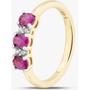 A timeless gold plated sterling silver ring featuring three oval-cut red cubic zirconia stones as the centrepiece, beautifully accented with brilliant-cut white cubic zirconia stones. This elegant design combines vibrant colour with classic sparkle for a striking, refined look. Item Code: S2226Y