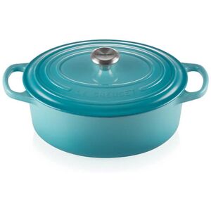With a 4.1 litre capacity, this Le Creuset Signature Teal Cast Iron 27cm Oval Casserole is the ideal size when cooking for 4-6 people. Just as versatile as Le Creuset’s round casseroles, this oval version cuts down on the space taken up in the oven. It can also be used on all types of hob, including induction, or under a grill. The cast iron construction is excellent at retaining heat, resulting in even cooking and browning. It will also keep cooked food warmer for longer when serving at the table. The tight fitting lid also helps the cooking process by locking in moisture and enhancing flavour. The light enamel interior makes cleaning easier whilst the large handles are easy to grip when lifting the casserole, even when wearing oven gloves. The heat resistant knob (oven safe up to 260°C) also provides a better grip when wearing oven gloves or mitts. Handcrafted at the Le Creuset foundry in northern France since 1925, Le Creuset casseroles are made from premium quality cast iron ensuring each product is beautifully finished and long lasting. A true kitchen essential, the cast iron oval casserole is not only perfect for making casseroles, stews and one pot roasts, but is versatile enough for baking cakes and bread. Le Creuset cast iron cookware also works efficiently at low to medium cooking temperatures and retains heat effectively, ensuring food stays warm for longer. Le Creuset cast iron casseroles are suitable for all hob types (including ceramic, halogen, induction, gas and oil or wood). They are also dishwasher safe although we would recommend hand washing. The Le Creuset 27cm oval cast iron casserole is ideal for 4-6 people and has a capacity of 4.1L. Dimensions: L35.2cm x W22.6cm x H15.4cm. Weight: 4.43kg. The Le Creuset Signature Teal Cast Iron 27cm Oval Casserole is supplied with a lifetime manufacturer's guarantee.