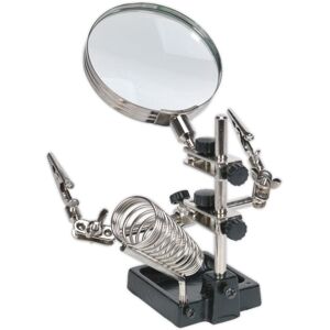 Sealey Mini Robot Soldering Stand with Magnifier & Iron Holder Features: Ideal for awkward jobs where a third hand is needed. Cast steel base for extra stability. Fitted with two fully articulated crocodile clamps and Ø90mm magnifying glass. Features soldering iron holder to safely store soldering iron when no longer in use. Technical Details: • Ideal for awkward jobs where a third hand is needed. • Cast steel base for extra stability. • Fitted with two fully articulated crocodile clamps and Ø90mm magnifying glass. • Features soldering iron holder to safely store soldering iron when no longer in use. • Model No. SD150H • Model No. SD150H Additional Information: • One of a comprehensive range of Sealey Hand Tools, suitable for daily use. • Ideal for awkward jobs where a third hand is needed. • Cast steel base for extra stability. • Fitted with two fully articulated crocodile clamps and Ø90mm magnifying glass. • Features soldering iron holder to safely store soldering iron when no