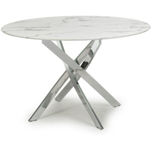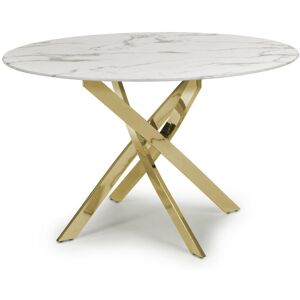 Elevate your dining experience with our stunning 1.2m Round Dining Table, designed to be the centerpiece of any dining room. This eye-catching table features a heat and stain-resistant tempered glass top, beautifully adorned with a chic white and grey marble effect print that adds a touch of sophistication to your space. The table is supported by a choice of either a luxurious gold or chrome frame, showcasing four elegantly wrapped legs that not only provide stability but also enhance its glamorous appeal. Comfortably seating up to four people, this table is perfect for intimate dinners or casual gatherings with friends and family. Sold individually, this table is a must-have for those looking to combine style and functionality in their home. Transform your dining area with this exquisite piece today! Metro Lane Table Base Colour: Gold