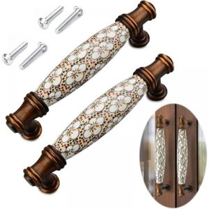 【Finish / Color】 Electroplating finish with antique bronze color and floral pattern. Elegant and beautiful, add exquisite decoration to your home. 【Material】 Zinc alloy + ceramic, corrosion resistance, wear resistance, not easy to fade, no scratches, no burrs. Smooth and shiny. 【Wide Application】 Perfectly suitable for kitchen cabinets, furniture doors, cupboards, desk drawers, wardrobe drawers, shoe cabinets, chests, bookcases, etc. 【Size】 Length 118mm / Hole Distance: 96mm / Height: 33mm. Reasonable size for comfortable grip. 【Package Content】 2 * Handles + 4 * screw.