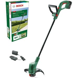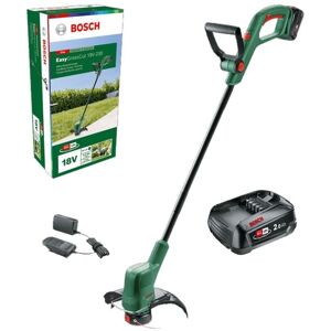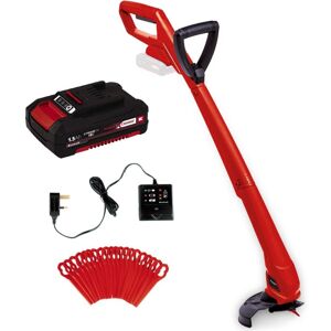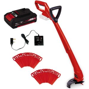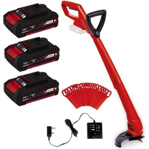 The Einhell GC-CT 18/24 Li P (2x1.5Ah) cordless grass trimmer is the ideal helper for bringing the garden and strips of grass into shape. Equipped with an 18 V / 1.5 Ah lithium-ion battery from the Power X-Change series, the grass trimmer has an operating time of up to 40 minutes. 3 LEDs show the charge status at a glance. The rechargeable battery can also be used in all other devices from the system series. For comfortable working without fatigue there is an additional handle for two-handed operation. The housing and the secondary handle are made of impact-proof, high-grade plastic. The cutting width is 24 cm with a speed of 8,500 rpm. Complete with two 1.5 Ah PXC rechargeable battery, one PXC charger and 20 plastic blades. Features Battery capacity indicator with 3 LEDs Accu can be used for all the tools in the Power X-Change family System charger included Incl. 20 plastic blades User-friendly two-hand operation thanks to additional handle Housing and handle made of