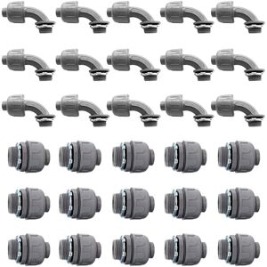 [High Quality Conduit Fittings] - Size: 3/4 Inch. Quantity: 30 Pieces, Contains 15 straight pipe and 15 90 degree conduit connector fittings. [SAFE AND STRONG] - resists salt water, weak acids, gasoline, alcohol, oil, grease, and common solvents. Molded of type nylon 6. classification 94V-2: temperature index 125℃ and harsh environments; resists abuse, pulling and squeezing; outdoor, sunlight resistant, direct burial, 50% lighter than metal conduit. [WIDE APPLICATIONS] - For indoor and outdoor use, the complete conduit/connector system is reusable.Applications: HVAC equipment; Machine tools; Marine equipment; Motors and controls; Printing equipment; Pumps; Refrigeration equipment; Transformer connections; Outdoor lighting. [EASY INSTALLATION] - No disassembly required. Instead, the installer simply pushes the conduit or tubing onto the ferrule, tightening the domed sealing nut. The completed assembly can then be secured in the chassis by the locknut (or first secure the connector into