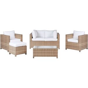 4 Seater Outdoor Sofa Set. A stylish and comfortable garden set. Its frame is made of rust-proof powder-coated aluminium. The sturdy construction is complemented by a low-maintenance, weather-resistant synthetic rattan ensuring this set’s longevity. High-density foam cushions are covered with a water-repellent and stain-resistant fabric. Practical armrests and relaxing backrests make it a comfortable seating area for a big group. Details: Product Type: Sofa Set Style: Scandinavian General Color: Beige, White Shade: Off-White Material Type: PE Rattan Main Material: PE Rattan Additional Material: Tempered Glass Top Material: Glass Material Composition: 100% Polyester Finish: Powder Coated Seats Up To: 4 People Dimensions: 2 Seater Sofa Dimensions: 140x75x69 Armchair Dimensions: 74x75x69 Coffee Table Dimensions: 90x50x35 Ottoman Dimensions: 51x51x35 cm Seat Thickness: 10 cm Seat Height: 38 cm Overall Dimensions: 140x75x69 Weight: 59.5 kg Table Weight Capacity: 70 kg Weight Capacity per
