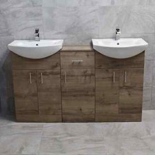 1450mm Double Vanity Basin Sink Unit Set Bathroom Storage Walnut Oak Finish Part of our Mediterranean range, this stylish double basin vanity unit includes lots of storage. With 2x Walnut Mediterranean 550 vanity units: Includes high quality 1 tap hole basin Unlike other listings our units come ready assembled (Not flat pack) Modern designer contemporary styling Soft close doors Chrome finish designer style handles Unit made from MDF, finished using high quality materials supplied by the paint manufacturers of Dulux Assembled using high quality German parts Manufactured in Europe Great for creating extra bathroom storage space - keeps all that clutter out of sight! 550mm unit sizes approx: Width: 550mm Depth: 435mm height: 865mm Drawerline Unit Matching finish 1 Cupboard 1 Drawer Includes high quality 1 tap hole basin Unlike other listings our units come ready assembled (Not flat pack) Modern designer contemporary styling Soft close doors & Drawer Chrome finish designer style handles
