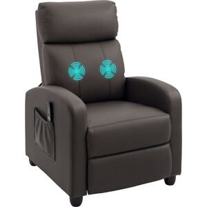 GENERAL DESCRIPTION This reclining massage chair from HOMCOM helps relieve stress and fatigue. It features two vibration massage points on the back, eight massage modes, and five intensity levels. The back can be manually reclined up to 150°, allowing you to lean back and relax. The chair is filled with sponge for comfort and covered in smooth faux leather for a stylish look. TECHNICAL SPECIFICATIONS Colour: Brown Material: PU, Sponge, PP Straight Dimension: 68W x 88D x 98H cm Reclining Dimension: 68W x 158D x 77H cm Seat Size: 48W x 50.5D cm Seat to Floor Height: 45 cm Seat Cushion Thickness: 27.5 cm Back Dimension: 52W x 57H cm Armrest Width: 9.5 cm Max Reclining Angle: 150° Input: AC100-240V, 50/60Hz Output: DC12V/0.5A Weight Capacity: 120 kg Item Label: 700-143V70BN FEATURES Two vibration massage points and eight massage modes Five intensity levels and two timer functions Manual 150° reclining back with footrest Wired remote control with storage pocket Thick padding on seat, back,