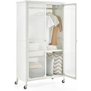This wardrobe combines aesthetic beauty with great practicality, which is a perfect storage solution for your home. The armoire closet features a sturdy hanging bar to hang your suits and coats. Additionally, 14-position adjustable shelf can suit your different storage needs, either for clothes or bedding. The cabinet top is perfect for placing frequently used essentials for easy access. Considering safety use, this wardrobe is equipped with anti-toppling device for better stability and safety. The modern storage cabinet will perfectly match well with other furniture and add aesthetic beauty to your living surroundings, whether in your bedroom or closet. Features: Sturdy metal clothing bar for hanging your suits and coats 14-position adjustable shelf provides options to store garments Heavy-duty metal frame ensures long-lasting use Equipped with anti-toppling device to avoid wobbling Reinforced X-shaped bracket for great support Comes with 4 flexible casters for easy movement 2