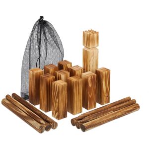 Are you a clever Viking and can you strategically throw enough wooden pieces to reach the 50-point mark? With this iconic throwing game, you'll have a great time outdoors with friends and family. Whether in the garden, at the park, or while camping, this Viking game made from red lacquered pine wood is perfect for summer fun in the sun. Adults can join in too! Kubb Viking Game in Detail - 1x throwing stick dimensions H x D: approx. 20 x 5 cm / approx. 180 g - 12x game pieces with numbers dimensions H x D: approx. 14.5 x 4.5 cm / approx. 100 g each - Carrying bag H x W: approx. 43 x 30 cm / approx. 20 g - Material: Pine wood, polyester - Colour: Red, gold, black Outdoor Wooden Throwing Game with Numbers - Fun for adults and children - A trendy Nordic game for summer - Great for garden, park, and camping - Includes a bag for convenient storage and transport - Enjoy playing with friends and family - Strategically aim to reach the 50-point target Game Instructions - Recommended number of
