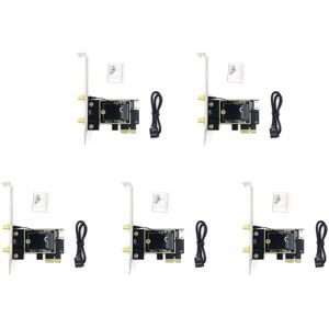 PCI-E to M.2 NGFF Wi-Fi card adapter designed for wireless applications on desktop computers. Standard NGFF M2 interface for better compatibility. Joint SMA head Users no longer have to worry about the problem of SMA head falling off. Supports similar ngff m2 wireless network card. Compatible with PCIE-1X, PCIE-4X, PCIE-8X, PCIE-16X slots. Precautions: AX201.9560AC.9462AC.9461AC not supported For 3160.3165.7260.7265AC For the unsupported version RTL and early for the unsupported version Suitable for wireless network cards similar to the following models: For 3160.3165.3168.7260.7265.8260.8265.9260.AX200.AX210 RTL 8723.8821.8822.8852 QCNFA 335.435.344. 943142.94371.94352Z.DW1560. Killer 1525.1435.1535.1550x.1650x Model: NGFF M.2 to PCIE Wi-Fi Card Support Module Interface: M.2 (NGFF) Material: PCB Color: Black Package Contents: 5 x Adapter Card 5 x Bluetooth Cable 5 x Screw Pack Only the above package content, other products are not included. Note: Light reflection and different