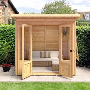 A modern summerhouse that is both attractive and practucal, the Parham Pent has double doors which open out to the front and a large opening side window which can go on either side. The three opening windows and doors are glazed in acrylic for your safety. It is constructed on 34mm square framing and clad with planed Shiplap tongue and groove boards made only from the highest grade, slow grown, FSC approved, northern European pine with T&G roof and floor. Dipped base coat preservative ready for you to top coat. All fixings, roof felt and assembly instructions are provided. Shire GB