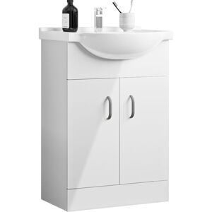 Product features: Floor Standing vanity unit Includes ceramic basin Modern yet simple handles ----Our bathroom furniture puts a new spin on contemporary minimalism with its stunningly simple door handles. An easy to access groove along the top of the doors means you won't need to have handles protruding, keeping everything looking stylish, neat and tidy. Soft-close Doors ----They're easy to open and when pushed they close smoothly shut with the slow close mechanism providing a quiet and fluid movement until closed. Spacious storage space for all your essentials ----this vanity units have just that with enough space to safely store any bathroom essentials you need, keeping everything nice and tidy for a clutter-free bathroom. Flat-Pack Specification: Material: MDF board + Ceramic Color: Gloos White Not Included: Waste and Tap Please do not book a plumber/fitter until you have received your items in satisfactory condition. Damages caused by 3rd party delivery companies are unfortunately