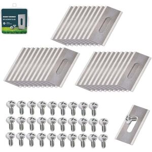 Compatible with Husqvarna: G1, G2, 105, 210, 220AC, 230ACX, 260ACX, 265ACX, 138, 30,5 315, 320, 330X, 330CX 420, 430X, 440, 450X; Compatible with Gardena: R38Li, R40Li, R45Li, R50Li, R7OLi, R75Li, R100Li, R100Li, R130Li, R130Li R165, R180 Silenco, Silenco City, Silenco+, Silenco Smart; Compatible with McCulloch: ROB R600, ROB R1000; Manufacturers: G-Froce 1000, G-Froce 1500.G-Froce 2500; Compatible with FLYMO: 1200R; Count: 1000, 1500, 2500. Size: 36.5.18.5.0.65mm.Material: Stainless steel.Thickness: 0.65mm.Package Contains: 30PCS one Box (one size fits all Screws).