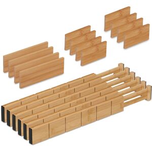 Chaotic drawers are a thing of the past with this drawer organiser. Thanks to the springs, the drawer organiser adapts to the size of your drawer, while the rubber coating on the sides prevents it from slipping and ensures a secure hold. This makes it easy to organise your cutlery, desk or chest of drawers. Simply organise the individual items in the drawer according to your needs. Drawer organiser system in detail - Dimensions of size-adjustable inserts H x W x D: approx. 6 x 43.5-57 x 1.5 cm / approx. 300 g - Dimensions of large connecting inserts H x W x D: approx. 6 x 18 x 0.5 cm / approx. 40 g - Dimensions of small connecting parts H x W x D: approx. 6 x 12 x 0.5 cm / approx. 30 g - Material: Bamboo - Colour: Natural Practical drawer divider for kitchen, office and co. - Keeps drawers tidy and organised - Organising system adapted to your needs - Arrangement can be changed quickly and easily - Connecting inserts for finer subdivision - Ideal for kitchen utensils, office supplies