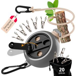 Practical design for comfortable drying: The laundry drying line can be rolled up quickly and easily thanks to the extendable crank. With enough space for up to 200 people. 15 items of clothing and a load capacity of up to 50 kg, it is ideal for traveling, camping or on the balcony. Quality carabiner. Superior performance for all seasons - Our innovative carabiner opens effortlessly, even in cold weather and withstands even the most adverse conditions. So you can be sure that your clothes are always hanging safely. ` the leash. Robust laundry clip with case - With 20 stainless steel laundry clips and a practical fabric bag, you are perfectly equipped. The clips can also withstand the elements and the bag allows for convenient transportation. Durable camping and travel accessories: Our rope with elasticated laundry rope is delivered in an environmentally friendly and plastic-free cardboard packaging. So you can be sure that you are not only keeping an eye on your dried laundry, but