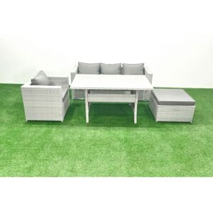 This 6 Seater Modern deluxe rattan garden furniture is best for multiple occasion. The Rattan set is strong durability which lasts for a long time, it also has strong tempered table top glass. Cushions are included and are fitted to the shape of the sofa and chairs for comfort. This wonderful product will help you showcase any garden, patio or conservatory. • Set Dimensions: • 1 x Sofa with double armrest: 177W x 65D x 66H cm • 2 x Arm chairs size: 74L x 65W x 66H CM • 1 x Side coffee table :65L x 65W x 66H cm • 1 x Big footstool :65L x 65W x 34H cm • 1 x Rectangular Dining Table :140L x 80W x 69H cm • Light grey mixed rattan with dark grey fabric .Color may some difference due to light or monitor .we are unable to return the item due to color problem . • Items Comes Flat Packed And Easy Assemble,Sturdy Galvanized Steel Tube Metal Frames With Powder Coating To Prevent The Rust • Flat PE Rattan Completely Made By Hand, 5mm Thickness transparent Tempered Glass With Sucker On Surface To
