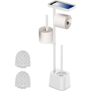With this elegant toilet stand, you always have toilet paper, spare rolls, and the toilet brush within easy reach. In addition, the practical shelf offers space for your smartphone, wet wipes, and more. Whether in the bathroom or guest WC, the freestanding toilet stand can be positioned flexibly and does not need to be fixed to the wall. The stylish design made of metal and plastic blends harmoniously into many bathroom interiors. The replaceable brush head ensures proper hygiene. Toilet set in detail - Dimensions H x W x D: approx. 65 x 29 x 11.5 cm - Weight: approx. 1.2 kg - Material: iron, plastic, stainless steel - Available in different colours Detailed dimensions of the toilet set - Length of toilet brush: approx. 36 cm - Brush head H x D: approx. 9 x 8 cm - Internal thread D: approx. 1.1 cm - Spare roll holder H: approx. 22 cm - Shelf W x D: approx. 19 x 11 cm Freestanding toilet paper holder with toilet brush - Practical combination of toilet paper holder and brush holder