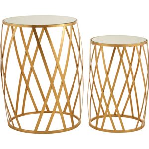 The combination of overlapping iron and sleek black gives these tables a gothic character. Vertical lines are pinched at the sides, producing a concave effect that softens the look. Iron is employed to create smooth round tabletops, with round stud detail on the rims that convey a hint of industrial aesthetic.