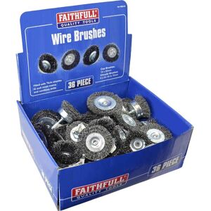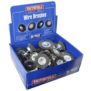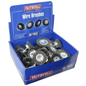 A selection of wire wheels of assorted sizes and shapes, with 1/4in shanks to suit most mains and cordless drills. They are ideal for preparing metal surfaces prior to painting, rust removal, decarbonising motor engines and cleaning of garden and contractor tools. 36 pieces. 18 x 50mm Cup Brushes. 6 x 50mm Circular Brushes. 6 x 65mm Circular Brushes. 6 x 75mm Circular Brushes. Although the wheels are supplied in a bulk of 20, your Faithfull stockist may be able to supply any individual wheel to the purchaser's choice. Not suitable for use in die grinders or high-speed air tools.