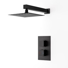 General description The Sky Bathroom shower faucets with dual shower head riser sets offer a stylish and practical choice for contemporary bathrooms. With bold angular lines and a matte black finish, this mixer shower adds a modern design element to any bathroom. The dual shower head and riser set is both functional and stylish, making it a great addition to your space. Made from solid brass, this shower set is built to last, catering to the needs of busy households. Technical specifications Shower Head Size: 10" (250 mm) Shower Hose Length: 1500 mm Pipe Centres: 150 mm +/- 18 mm Inlet Connection Size: G1/2" & G3/4" Minimum Bar Pressure: 0.05 Bar Maximum Bar Pressure: 0.5 Bar Shower Top to Bottom Adjustability: 764 mm - 1184 mm 1st Outlet Flow Rates: 1.0 Bar 3-5 L/MIN, 2.0 Bar 6-8 L/MIN, 3.0 Bar 9-11 L/MIN Handset / Bottom Outlet Flow Rates: 1.0 Bar 2-4 L/MIN, 2.0 Bar 5-7 L/MIN, 3.0 Bar 8-10 L/MIN Compatibility and accessories UK standard size fitting Package contents: thermostatic