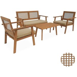 Cane finish Acacia wood from forests Wood already oiled Vintage garden furniture The Bohémia garden furniture is perfect to enjoy the beautiful days with your family or friends. The set includes a 2-seater sofa, 2 armchairs and a coffee table which will allow you to fully enjoy the sun. Its acacia wood structure and its cane backs give it a vintage style that will bring a real charm to your outdoor furniture. It will look great in your home or office. The beige cushions will make it look like a modern piece of furniture. Acacia wood: robust and from an certified plantation This robust structure is made of acacia wood from certified plantations. This wood is covered with an oil that protects it while leaving a colour that is as close as possible to the raw colour of the wood. Further information We recommend that you protect your acacia garden furniture during the winter months. Store them in a cool, well-ventilated place, away from all sources of moisture. If you plan to use a cover,