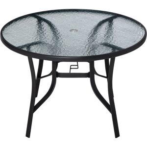 A simple outdoor table which helps to keep you shaded: this Outsunny side table which comes with a parasol umbrella hole. The steel frame is strong, with four legs to support and keep it balanced. It's fitted with a safe tempered glass table top to create a handy holding/small dining surface. The middle hole and bottom holder allow room for our Outsunny parasols so you can relax without getting burnt. Start summer the right way. Specifications: ● Colour: Black, Transparent ● Material: Tempered Glass, Steel ● Overall Dimension: Ф106.5 x 71H cm ● Umbrella Hole Diameter: 40mm ● Weight Capacity: 45kg ● Item Label: 84B-777 Features: ● Centre umbrella hole for optional sun protection ● Water-waver tempered glass creates a safe holding and dining space ● Sturdy steel frame for a strong structure. Four legs for balance ● Easy to wipe clean ● Maximum load 45kg, assembly required