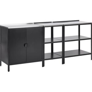 Garden Kitchen Island and Cabinet Set. An outdoor kitchen set, designed for utter convenience, includes three pieces: two kitchen islands and a cabinet. Featuring open and cupboard shelves, it is perfect for food and kitchen accessories storage. With this set, you can remain engaged with your guests while preparing meals outdoors, eliminating the need to constantly retreat to your indoor kitchen. Made from stainless steel with powder coating, the furniture is fully prepared for outdoor conditions, ensuring durability. Its practical construction includes a tabletop, perfect for prepping ingredients or using as a grill station, allowing you to relish the joys of outdoor cooking. Details: Product Type: Garden Kitchen Style: Modern General Color: Black, Silver Material Type: Metal Main Material: Steel Additional Material: Stainless Steel Top Material: Metal Finish: Powder Coated Dimensions: Overall Dimensions: 90x80x44 Weight: 40 kg Weight Capacity: 10 kg Shelf Weight Capacity: 10 kg Top