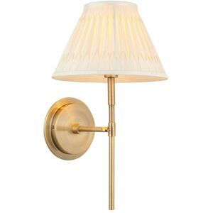 Specification Endon Rennes & Chatsworth Wall Lamp with Shade Antique Brass Plate & Ivory Silk Finish: Antique Brass Plate & Ivory Silk Material: Steel & Fabric IP Rating: IP20 Height: 50cm Width: 25.5cm Projection: 29.5cm Lamp Type: E14 No. of Lamps: 1 Bulb Included: No Dimmable: Yes Wattage (max): 6W Description Classic modern design styling Antique brass metalwork Dimmable 10 inch double pinch pleat ivory silk tapered shade Perfect for use with E14 candle LED filament lamp 6W LED E14 (Required) Proj: 295mm H: 500mm W: 255mm Class 1