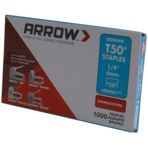 Description The Arrow ARRT5014SS T50 Staples are heavy-duty, rust-resistant staples made of stainless steel. Designed for use with T50 and similar staplers, these staples provide strong holding power for various applications, including woodworking, upholstery, and light construction. They are suitable for stapling paper, light fabrics, and thin plastics. Specifications Size: 1/4 inch (6mm) Material: Stainless Steel Package Quantity: 1000 staples Type: Heavy duty Compatibility and Accessories Compatible with T50, T55, T50PBN, HT50P, HTX50, ETFX50, ETF50P, CT50K, 5700, 8000 staplers Installation Insert the staples into the stapler magazine Ensure the stapler is properly loaded before use Usage Use for heavy-duty stapling tasks such as upholstery, carpentry, and light construction Suitable for stapling paper, light fabrics, and thin plastics