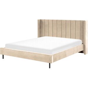 Upholstered Bed Frame. An elegant bed with a contemporary design that features a high headrest. The rectangular shape of the bed looks very traditional, but combined with vertical lines on the headrest creates a modern look. Its legs are small and do not draw the attention away from the chic design, but ensure a strong, sturdy, and durable construction. The whole bed is covered in taupe velvet, elevating its sophisticated look. Details: Product Type: Double Bed Style: Glam General Color: Beige, Black Shade: Taupe Material Type: Fabric Main Material: Velvet Additional Material: Plywood Material Composition: 100% Polyester Fabric Upholstered Back: No Dimensions: Headrest Dimensions: 165x115 Width: 166 cm Length: 220 cm Height: 115 cm Sleeping Surface: 140x200 cm Weight: 59 kg Weight Capacity: 300 kg Offer Includes: 1 x Bed Frame, 1 x Slatted Frame (26 Sprung Slats), Not Included: Mattress, Bedding and Cushions Key Features: Very Comfortable, Chic Look, Modern Design, Solid Workmanship,