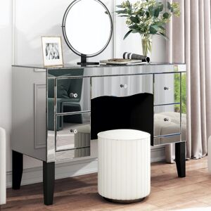 3-COLOUR DIMMABLE LED MIRROR: Vanity desk, The Φ45cm round vanity mirror comes with an LED light strip that is powered via a USB port. Makeup desk, The light can be switched between cold, neutral and warm colours at the touch of the power button and the mirror can rotate 360° to provide professional-quality lighting for makeup and skincare LARGE STORAGE SPACE: Vanity table, The 100x40cm tabletop and 5 solid wood drawers provide plenty of space for storing skincare products, cosmetics and jewellery. The drawers of the dressing table have three-section runners and black metal handles for easy access. The side cabinet can be mounted on the left or right and its position can be adjusted FCS CERTIFIED HIGH-QUALITY MATERIALS: White dressing table, the E1 grade MDF board, solid wood and painted metal make the dressing table with mirror sturdy and stable. The table has a load capacity of 50kg. The tabletop and the stool seat are made of FSC-certified wood IMPROVED STABILITY: The makeup table