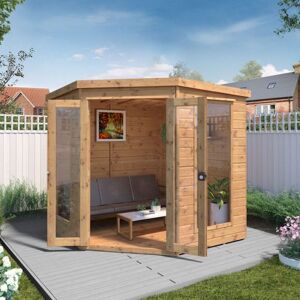 The Corner Summerhouse is a fantastic product with a contemporary design that fits neatly into the corner of a garden. Constructed of 12mm shiplap tongue and groove cladding it features double doors secured with a lock and key and safety styrene glazed windows. Styrene is a hard-wearing plastic that will not shatter like glass if broken. The Premium Corner Summerhouses are fully tongue & groove clad throughout and include an upgraded 12mm tongue and groove roof and floor as standard.