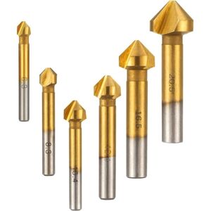 6pcs 90 degree triangular end mill set, suitable for metal and some non-metallic material processing, such as carbon steel, steel, thin iron plate, insulation board, PVC board, aluminum plate, soft and hard wood, plastic, etc. Titanium coated bevel cutter is very strong, high precision for circle processing and other durable features. These bevel flutes eliminate burrs and leave no scratches. Universal size, compatible with all kinds of drill bits, drill presses, including vertical drill presses and other common end mills. Total length: 63mm, 61mm, 59mm, 48mm, 47mm, 43mm. Top diameter: 20.5mm 16.5mm 12.4mm 10.4mm 8.3mm 6.3mm. Bottom Diameter: 10mm 10mm 8mm 6mm 6mm 5mm Dimensions: Total Length: 63mm, 61mm, 59mm, 48mm, 47mm, 43mm. Top Diameter: 20.5mm 16.5mm 12.4mm 10.4mm 8.3mm 6.3mm. Bottom Diameter: 10mm, 10mm, 8mm, 6mm, 6mm, 5mm. Package Included: 6 x Walnut Cutter