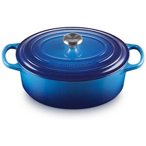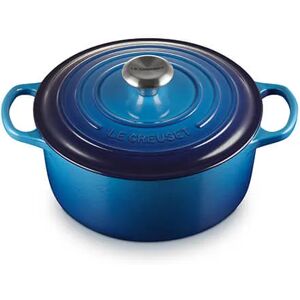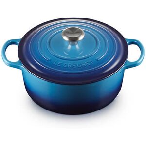 This Le Creuset Signature Azure Cast Iron 24cm Round Casserole is an essential kitchen classic and ideal for a wide array of one-pot recipes - from a fifteen minute pasta ragu and a slow-cooked, fragrant stew to tender, juicy roasts and freshly baked bread and cakes that rise to perfection and bake evenly. ADVANCED SAND INTERIOR ENAMEL - durable and easy to clean, specifically engineered to resists staining and a higher resistance to wear and tear. Significantly improved durability and performance including: 35 - 40% more resistant to thermal shock, 16% more resistant mechanical shock (chipping from utensils), more resistant to acid attack, 24% more resistant to enamel erosion, even less absorption of food colours, more durable against repeated dishwasher use and 45% easier to clean. LARGE HANDLES - easier to grip and lift, even with oven gloves or mitts, when full. ERGONOMIC STAINLESS STEEL KNOB - stylish and durable brushed stainless steel finish. Provides an easy, comfortable and natural grip. Suitable for all temperatures. ENGINEERED LID - tight fit with built in stabilizers for enhanced moisture lock in and flavour when cooking. Handcrafted at the Le Creuset foundry in northern France since 1925, Le Creuset casseroles are made from premium quality cast iron ensuring each product is beautifully finished and long lasting. A true kitchen essential, the cast iron round casserole is not only perfect for making casseroles, stews and one pot roasts, but is versatile enough for baking cakes and bread. Le Creuset cast iron cookware also works efficiently at low to medium cooking temperatures and retains heat effectively, ensuring food stays warm for longer. Le Creuset cast iron casseroles are suitable for all hob types (including ceramic, halogen, induction, gas and oil or wood) and are also oven and grill safe. Dishwasher safe, although hand washing is recommended. The Le Creuset 24cm round cast iron casserole is ideal for 4-5 people and has a capacity of 4.2L. Dimensions: L32.5cm x W25.2cm x H16.6cm. Weight: 4.31kg. Made in France. This Le Creuset Signature Azure Cast Iron 24cm Round Casserole is supplied with a manufacturer's lifetime warranty.