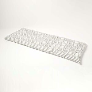 Brand Homescapes Size Available Three seater (143 x 48 x 5 cm) Colour Grey Cover Material 100% Cotton Filling Polyester Care Instructions Machine Washable at 40°C. When not in use keep out of direct sunlight and rain Pack Includes 1 Bench pad Pattern Striped Grey garden bench cushion, grey and white thin stripe 100% cotton seat pad with decorative tufted design, 2 and 3 seater extra-long indoor and outdoor cushions. Grey Seat Cushion Comfortable and generously filled bench seat cushions for garden benches, sun loungers and patio furniture. Add comfort to you outdoor seating area and garden with Homescapes' 2 and 3 seater cushions, filled with a supportive and durable super microfibre. Woven from soft 100% cotton, bench seat cushions feature a tufted design. Extra-Long Cushion Add colour and style to your home or garden, these on-trend grey and white stripe cushions will complement all décor colours and styles and will add comfort to your wooden or metal furniture. A versatile cushion,